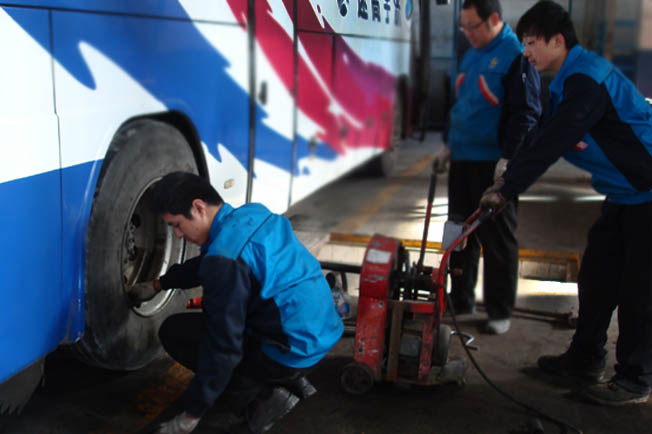 在汽車保修廠檢測線采訪小組觀看了班車安全檢測的全過程