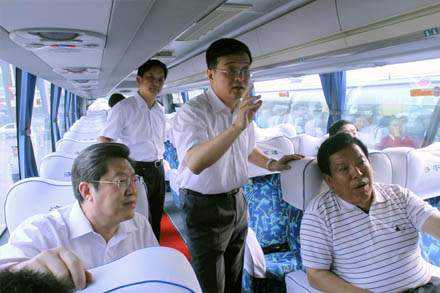 王副局長(zhǎng)先后視察了濟(jì)南長(zhǎng)途汽車(chē)總站的安檢、總服務(wù)臺(tái)、檢票、售票、熱線等崗位,與黨的十八大代表、總站金牌檢票員李文親切交談,勉勵(lì)她在平凡的服務(wù)一線崗位上將親情服務(wù)持續(xù)發(fā)揚(yáng)下去。王副局長(zhǎng)一行領(lǐng)導(dǎo)專(zhuān)門(mén)登上代臥車(chē)、臥鋪車(chē),向安全行車(chē)370萬(wàn)公里“零事故”駕駛員、省勞模賈湘鳴及宜昌臥鋪班車(chē)駕乘人員詳細(xì)詢問(wèn)了車(chē)輛改造、安全運(yùn)營(yíng)以及車(chē)載GPS的使用情況;在安全監(jiān)控中心重點(diǎn)了解了車(chē)輛3G視頻及GPS監(jiān)控管理情況。