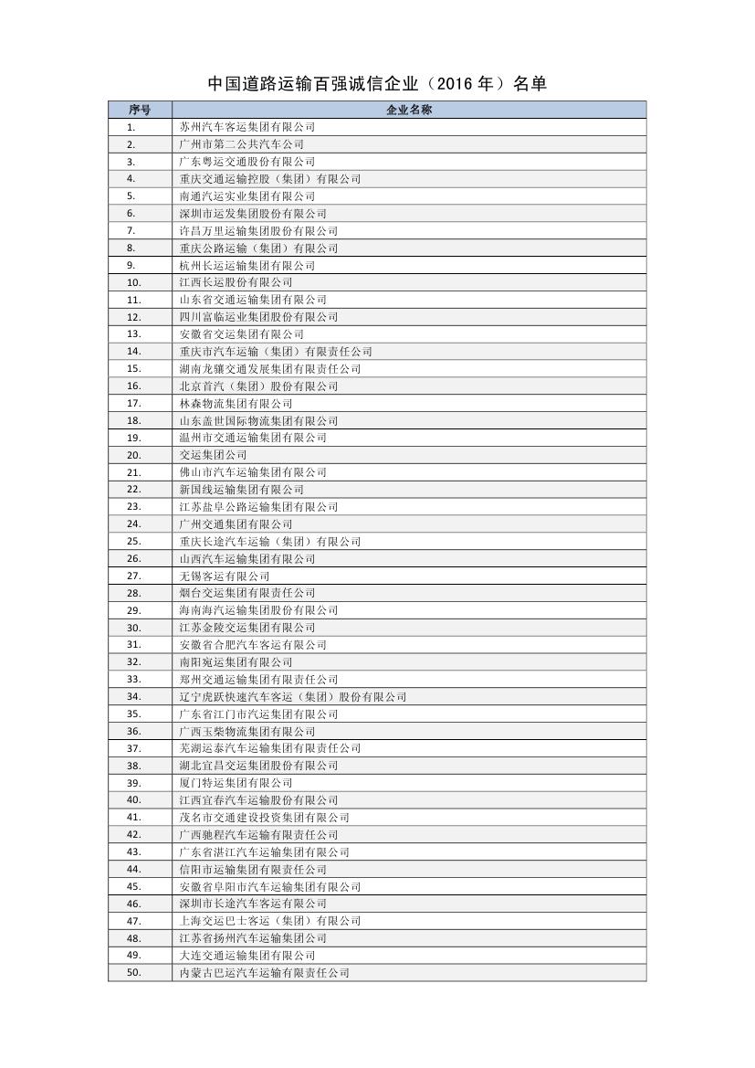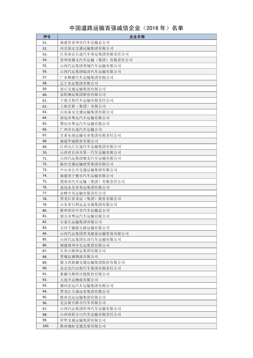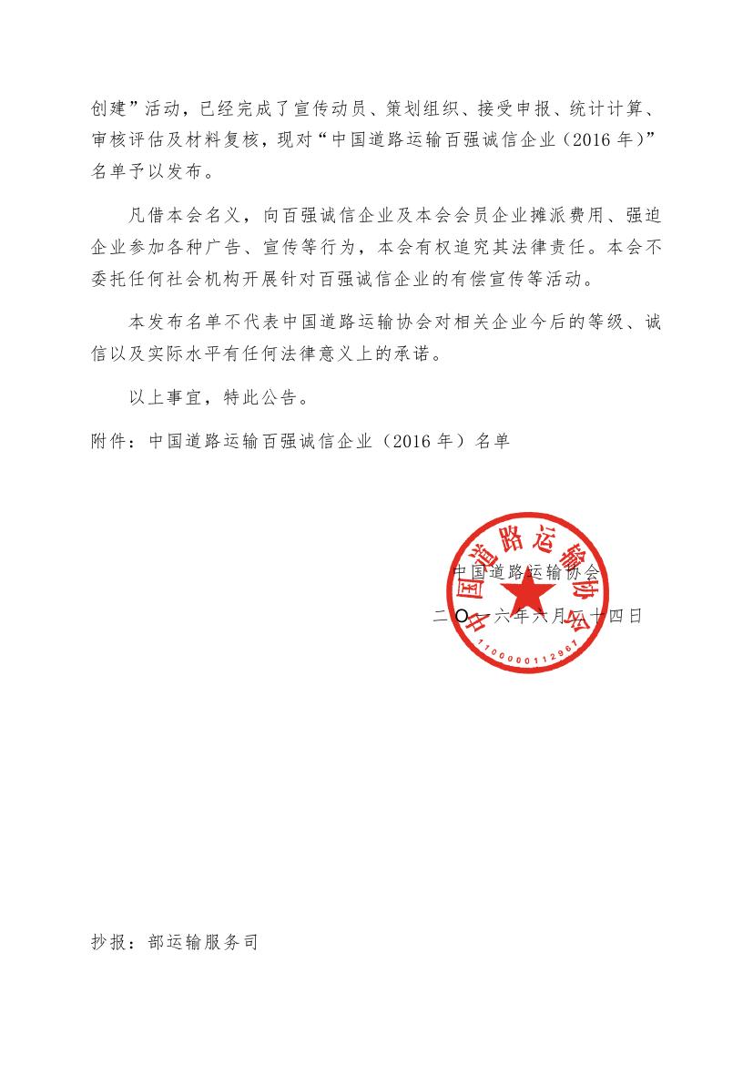 6月24日,中國道路運輸協(xié)會發(fā)布了2016年度道路運輸百強(qiáng)誠信企業(yè)名單,集團(tuán)再度榮獲“全國道路運輸百強(qiáng)誠信企業(yè)”稱號,排名第十一位,比去年前進(jìn)一個名次。