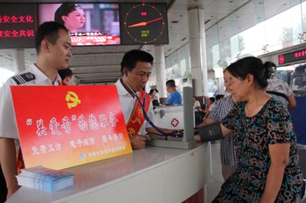 在總服務臺,總站南區雷鋒大夫魏德泉為乘車旅客提供免費義診和夏季乘車健康咨詢服務;由車站微機室、后勤科組成的電子維修組,為旅客提供免費的手機充電器,提供免費電子、電器簡單維修服務;由一線服務科室黨員組成的服務咨詢組在公交站牌、旅客中轉換乘區設立了免費咨詢服務崗,為旅客提供免費咨詢和行李運送服務,并在長廊設立了“黨員送水車”,為旅客提供免費送水服務,得到了旅客的一致好評。