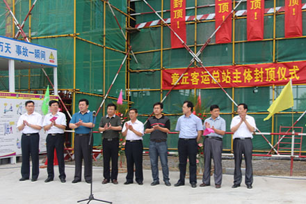 16分,隨著最后一方頂板混凝土澆筑完成,章丘客運總站一期工程主體順利封頂,標志著工程正式轉入裝飾裝修階段。章丘市交通運輸局局長王建、副局長冉祥寶、集團公司副總經理徐文寶、基建部部長康殿金、章丘分公司總經理石修忠以及監理施工單位負責人參加了此次封頂儀式。