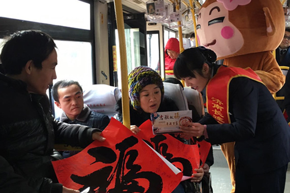 您現在的位置是:首頁 > 客運場站產業 “萌猴”小年送福 扮靚回鄉之旅 次 客運場站產業 發布時間:2016-02-04 10:14:05 “萌猴”小年送福 扮靚回鄉之旅 2月1日是農歷的“小年”,在濟南長途總站南區的候車長廊里,兩個萌萌的“猴寶寶”讓候車旅客紛紛拿起手機,爭相合影。 為讓旅客感受到濃厚的過年氣氛和總站南區溫馨的親情服務,南區裝扮了兩個卡通“萌猴”和站務員一起,在候車長廊和班車上為廣大旅客“送?!焙退湣M瑫r,還向乘車旅客贈送“吉候送?!?span lang=EN-US>2016新春VIP打折卡,讓廣大旅客的回鄉之旅充滿吉祥和歡樂。 (總站南區 朱吉昀)