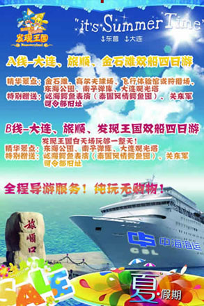 此次“冰點大連豪華游輪休閑四日游”620日首發團,周五出發,周一返回。在濟南乘空調旅游車赴東營港乘坐“長山島”號豪華游輪,直達浪漫之都大連,游客可充分感受游輪出行與大連的獨特魅力!限時勁爆價:A790/人,B950/人,詳情可咨詢旅游熱線:58888999